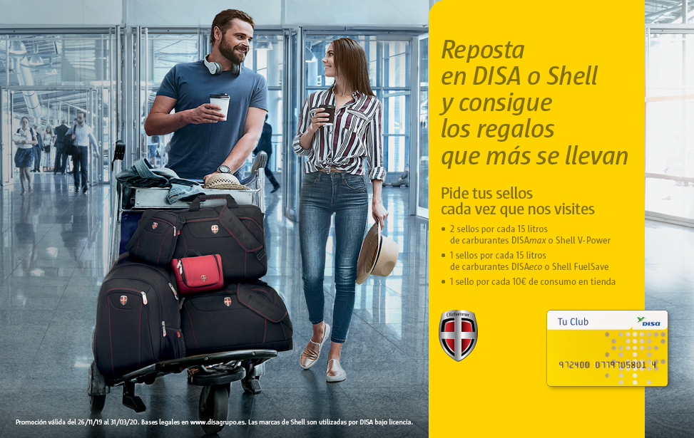 *Promoción válida del 26/11/19 al 31/03/20 o hasta fin de las unidades totales de artículos en promoción, en estaciones de servicio Shell y DISA adheridas a la promoción en Península, Andorra, Baleares, Islas Canarias, Portugal, Ceuta y Melilla. Disponibles un total de 118.000 artículos de viaje para toda la promoción. Bases de la promoción con condiciones y precios disponibles aquí.