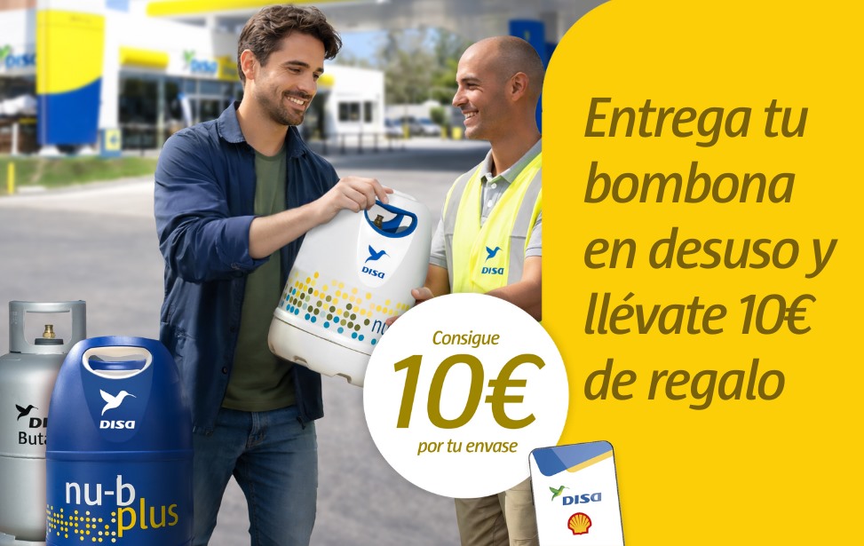 Consigue un cheque regalo de 10€ de descuento para consumir en nuestras estaciones de servicio DISA y Shell por cada bombona en desuso que nos entregues en las estaciones participantes.